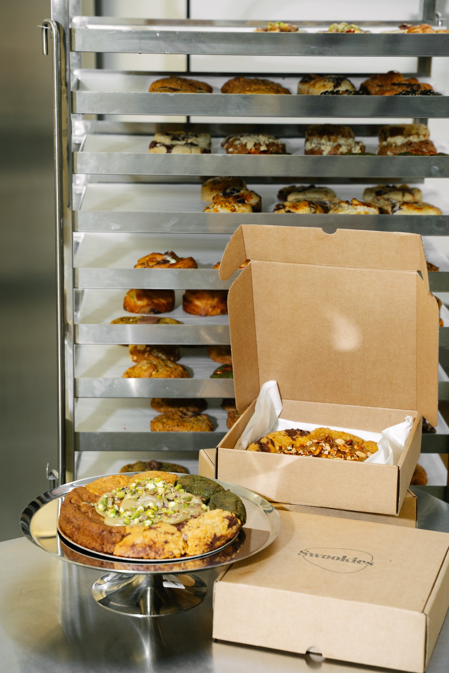 Le Swooky c'est un gâteau façon cookie, qu'on pose au milieu de la table et qu'on se partage. Il est composé de quatre de nos cookies best-sellers : le chewy, le double crispy, le matchy et le sunny. Les pâtes sont cuites ensemble pour ne former qu'un.