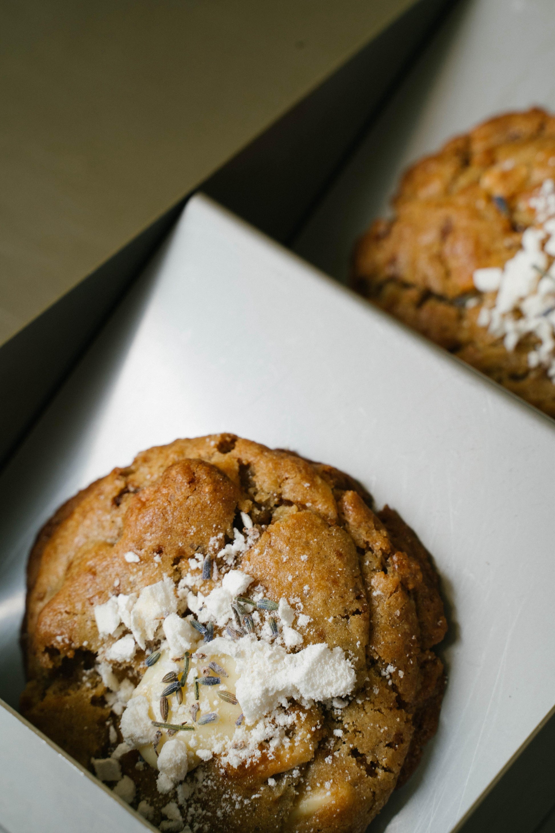 Le Bloomy célèbre les souvenirs d'été en mettant à l'honneur la lavande, cette fleur au parfum nostalgique. Le Bloomy est un cookie aux pépites de chocolat blanc avec un insert de crème au citron à la lavande, parsemé de meringue à la lavande. Un cookie monochrome mais virevoltant en saveurs.