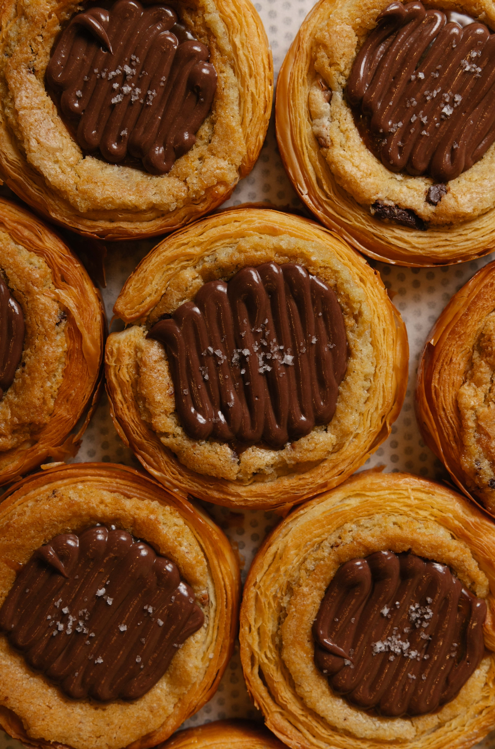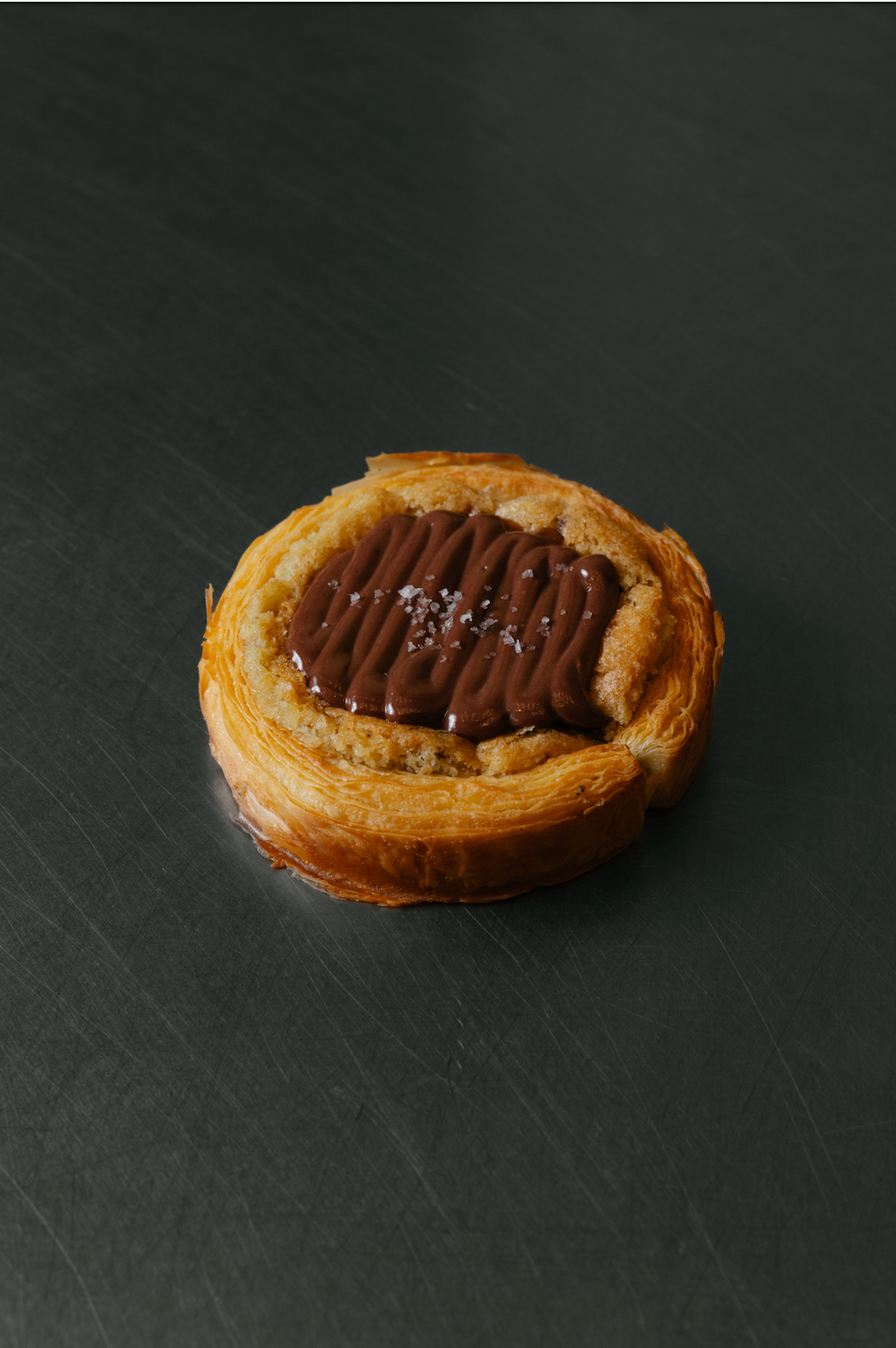 Le Puffy, notre création de décembre signée Swookies x Brood, combine un swirl de pâte à croissant artisanale parfaitement feuilletée avec un cœur de cookie double crispy (chocolat noir, chocolat au lait, fleur de sel). À l’intérieur, un insert de caramel beurre salé maison apporte une touche fondante, tandis qu’une ganache chocolat noir intense équilibre le tout. Croustillant à l’extérieur, moelleux et fondant à l’intérieur, ce cookie-hybride unique est la rencontre parfaite entre croissant et cookie.