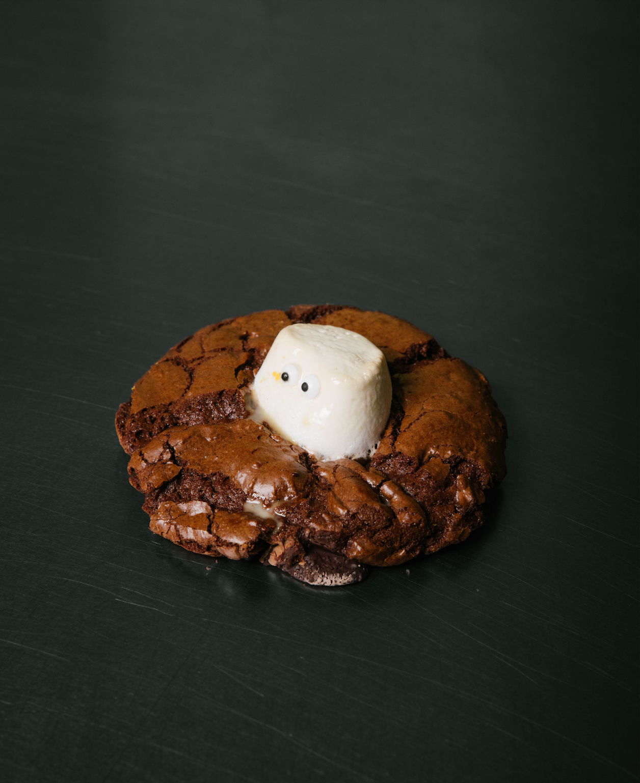 Le Brooky s’est transformé en repaire de fantôme ! Dans son cœur de cookie fondant et brownie au chocolat noir, un fantôme gourmand s’est retrouvé piégé. Un monstre moelleux et intensément chocolaté qui hante les papilles.